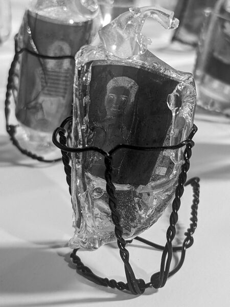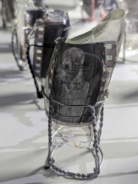 Faux Diamonds responds to these tensions. Black-and-white negatives of my 1989 students—also used in Pavlov’s Children—are encased in resin and placed inside wire cages made from champagne bottle tops. Displayed in a tabletop cabinet and lit from above, they resemble trapped gemstones. But up close, these “jewels” reveal themselves as suspended fragments of memory. The display evokes ceremonial stillness, hinting at both freedom and entrapment—liberation gained, but constrained by ideology or disappointment. It also alludes to Western romanticism of socialism, viewed at a distance.