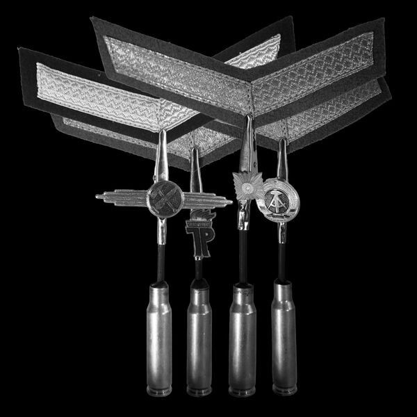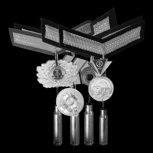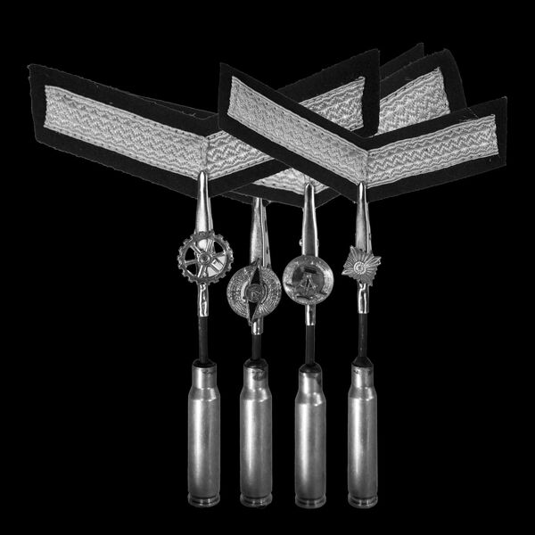 This installation centres on 28 gold textile chevrons from the National People’s Army (NVA), each mounted on a black wooden stalk inserted into a spent rifle shell casing. Beneath each chevron sits a matching military badge, forming a regimented formation. The 28 sculptures are arranged in two shadow boxes (44 cm high x 80 cm long × 24 cm wide ). Behind them, chalkboards list the names of 140 people who died at the Berlin Wall. Spotlights partially obscure the writing—suggesting the tension between remembrance and erasure, order and loss.