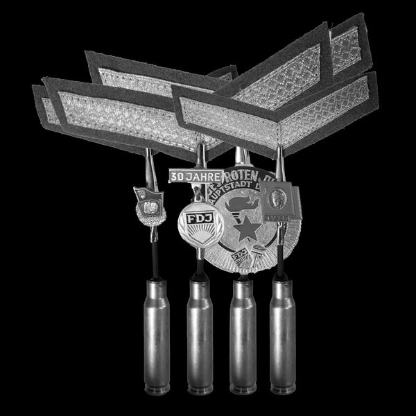 Seven black-and-white photographs, (40 × 40 cm each), draw from insignia used in youth organisations like the Pioneers, FDJ, and GST. These symbols shaped identity through obedience and belonging.