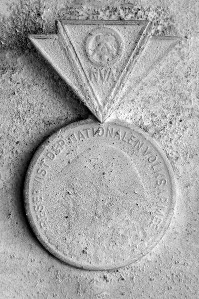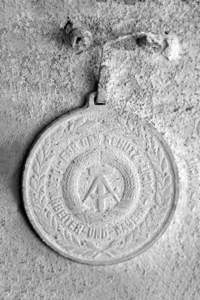 Close-up photographs show FDJ and Pioneers badges alongside military medals, all flattened to the same scale. This equalisation questions hierarchy, highlighting the shared ideological function of such symbols across age groups. Some artefacts also appear embedded in air-dry clay slabs—partially visible or paired with their imprint—displayed on a 100 cm-long white shelf.